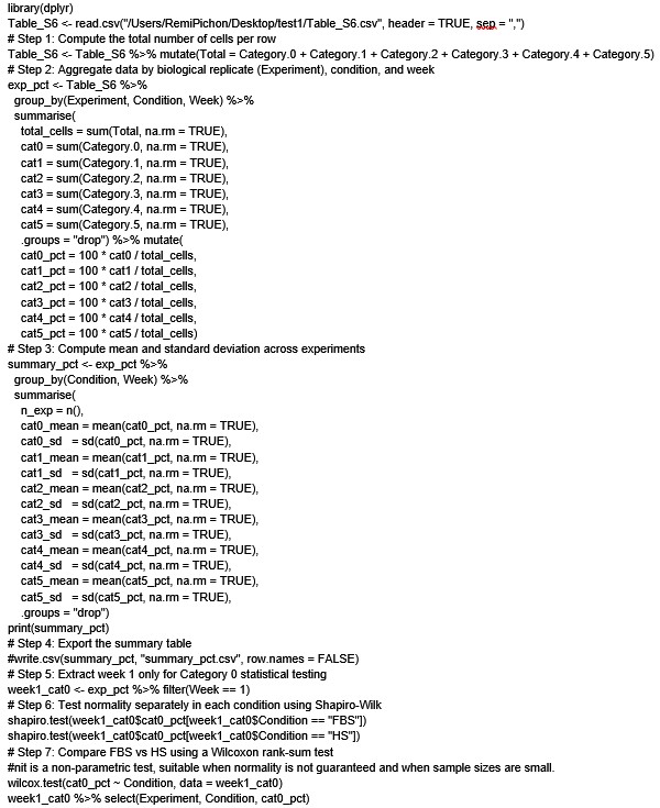 For clarity, in Author response image 1 we provide the R script used to perform the statistical tests on the data shown in Supplementary Table S6 (column Raw count of parasite developmental category per image and experiment)