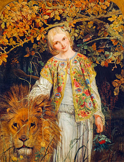 A ramping Lyon rushed suddainly, Hunting full greedie after saluage blood; Soone as the royall virgin he did spy, With gaping mouth at her ran greedily, To haue attonce deuour’d her tender corse: But to the pray when as he drew more ny, His bloudie rage asswaged with remorse, And with the sight amazd, forgat his furious forse.