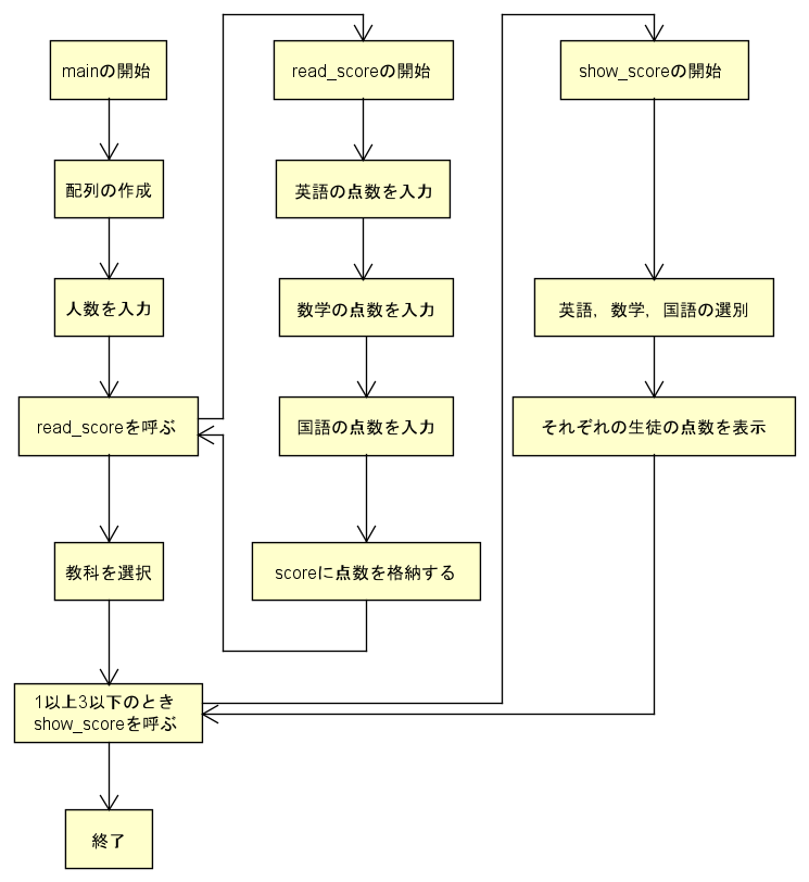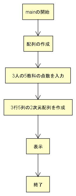 n人の学生の3科目の得点を端末から読み込み,整数型2次元配列scoreに格納する