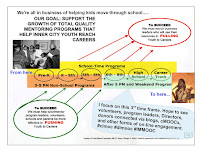 Over the years I began to understand that our work was more than to provide weekly one-on-one tutoring and mentoring but to build a system of volunteer-based adult support that helped kids move through school and into adult lives. I've used this graphic often to communicate that idea. Here's one example.