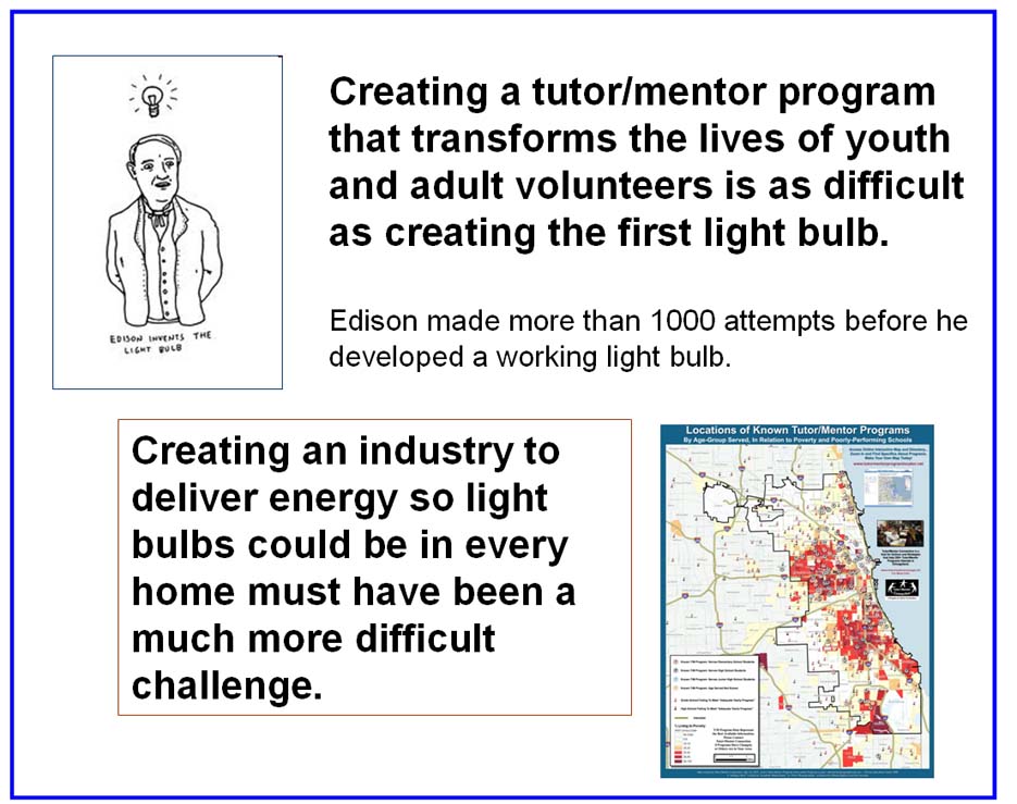 I've used maps of Chicago since 1993 because they focus attention on all of the places in Chicago where great tutor/mentor programs are needed. I used a map in this Thomas Edison inspired graphic to show that we need to constantly be learning and innovating in order to build and sustain great programs in more places.